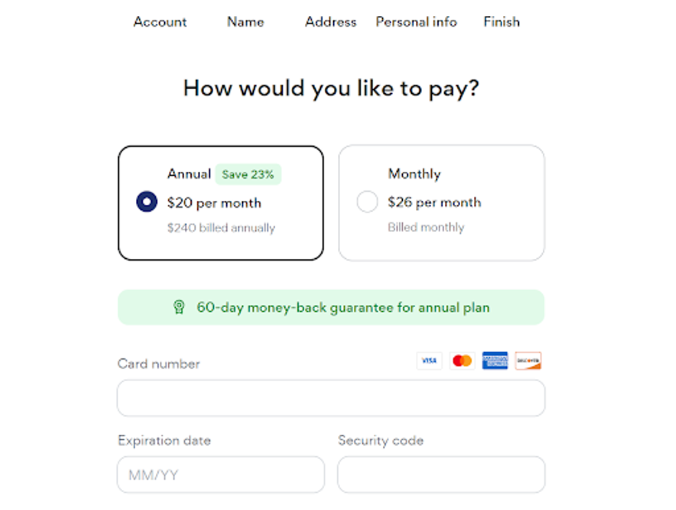 Now that you’ve picked a plan, created an account, and have entered all of the info needed to verify who you are, you’re almost done! The last step is deciding how you’d like to make your purchase. Luckily, with Aura, there’s an option to pay monthly or annually; all annual plans come at a discounted rate and include the company’s 60-day money-back guarantee.