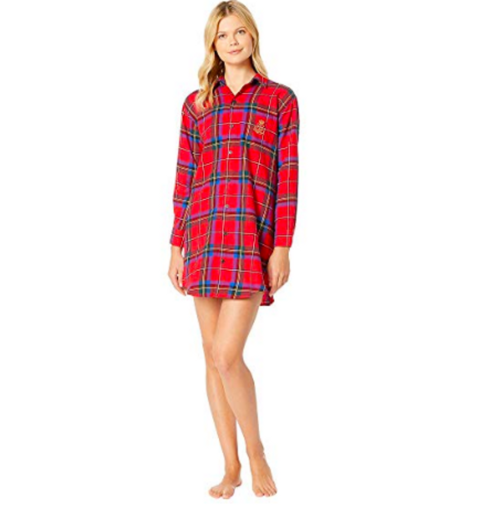 A lightweight flannel sleep shirt is another great way to stay comfortable this winter without overheating. This one from Ralph Lauren has a classic plaid pattern and is made of brushed cotton for extra softness. It features long sleeves, a point collar, a shirttail hemline, and the signature “LRL” monogram on the chest pocket.