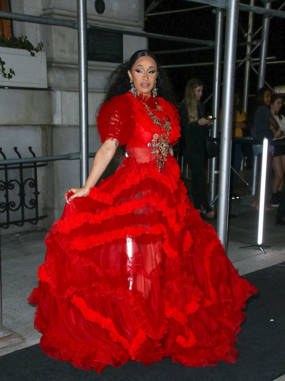 This is the dress Cardi wore to the New York Fashion Week party where she famously threw a shoe at Nicki Minaj, her nemesis. It’s pretty badass to throw a shoe in a full-on ball gown; if you think this might be the look for you, just work your hair into a tight, low pony-tail and find yourself a red lacy gown and a gold statement necklace to really show everyone who’s boss.
