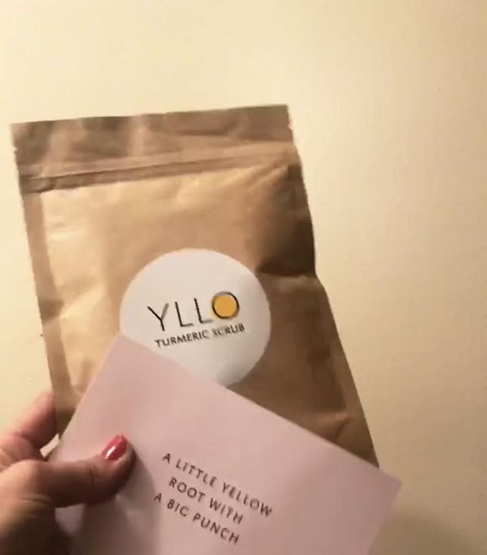 Now what you’ve all been wondering. Yes, the scrub is yellow. Really yellow. Colored naturally by Turmeric’s natural yellow hue, the product has simple natural ingredients: turmeric, chickpea flour, cold pressed coconut oil, cane sugar, sea salt, vitamin E, and lemon essential oil. Yllo Scrub’s turmeric scrub is also vegan and cruelty free.