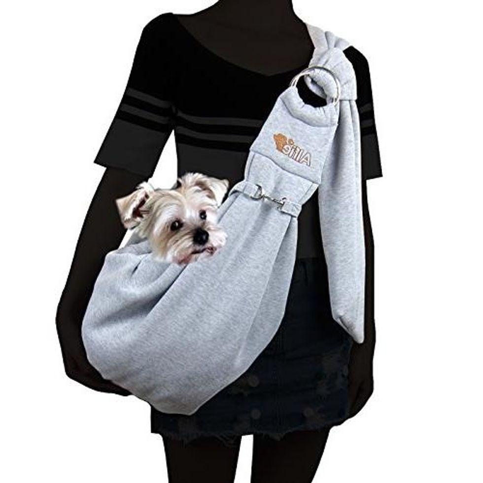 While pretty much only for small dogs, this comfortable sling is secure and cozy, and it offers super easy access to your pooch. Its shoulder strap is adjustable and also has a safety collar hook. Not to mention it’s machine washable and, let’s face it, SO fashionable